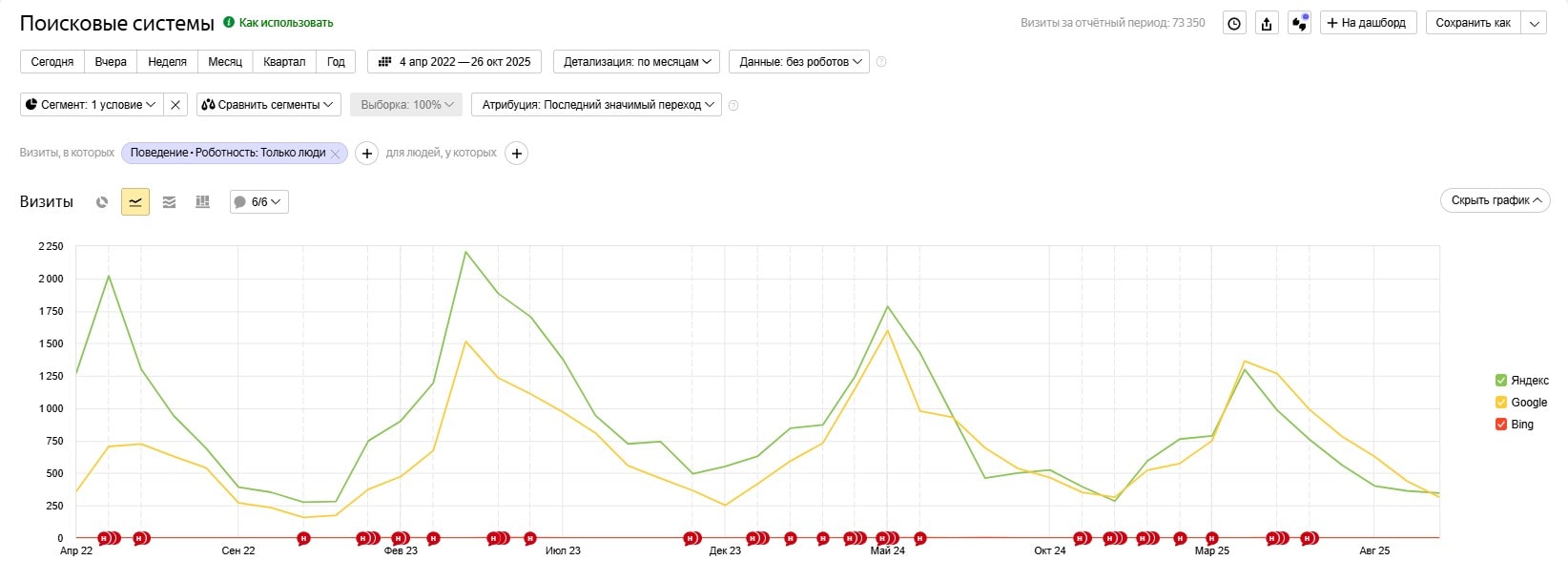 За время работы нам удалось поднять позиции с 43% до 100% в ТОП-10. В ТОП-3 находится 95%. Трафик увеличился на 74%, а количество заявок в 3 раза. Переходы из поисковых систем за последний год составили 53,1%, что составляет 5 369 визитов.